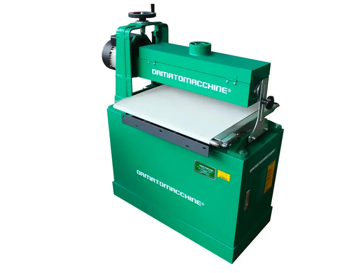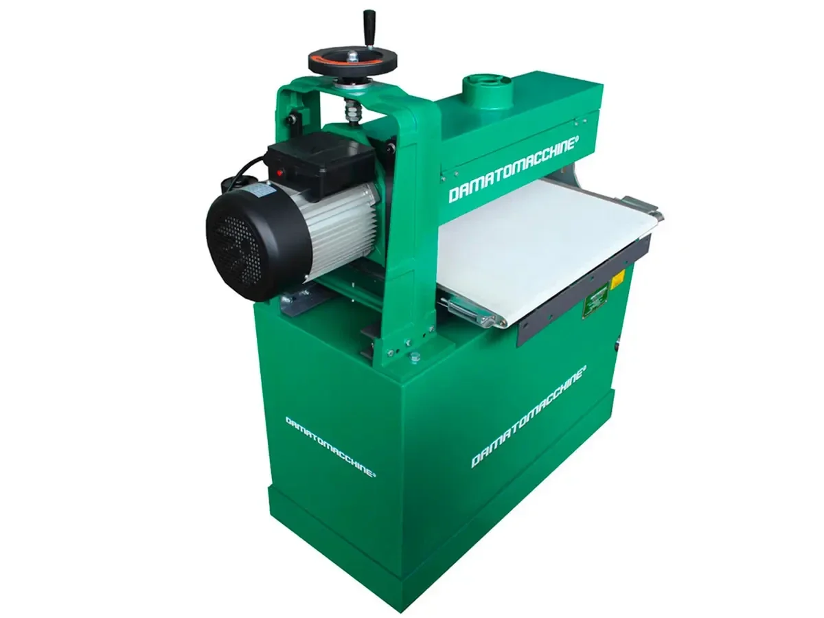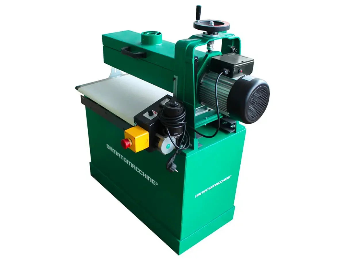 ponceuse à bande (papier de verre interchangeable) fixée sur un rouleau à vitesse variable qui peut atteindre la vitesse maximale de rotation de 1440 tr / min. La machine a deux moteurs: le premier de 24 W qui est utilisé pour l’avancement de la pièce et le deuxième de 1500 W (plus robuste) pour la rotation du rouleau abrasif. Cette ponceuse est équipée avec un variateur de la vitesse et la pièce a un avancement automatique. Elle est capable de lisser toutes les surfaces du bois, panneaux et profils. La machine est entièrement fabriquée conformément aux normes CE.